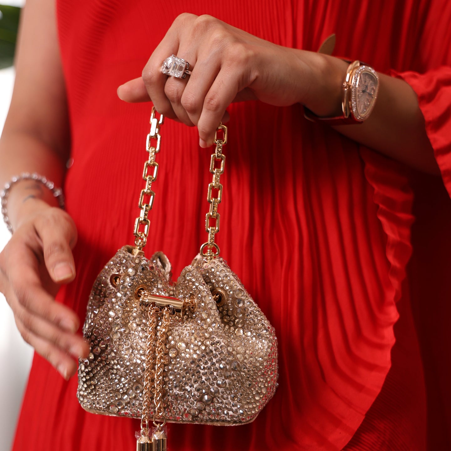 These mini bucket bags have are sized at 12*10*8(L*W*H) cm with a wrap around gold chain which acts as a closure for the bag too. It is accompanied with a regular sling chain and has a statement custom made gold wrist link chain that will just add oodles of glam to your style.
