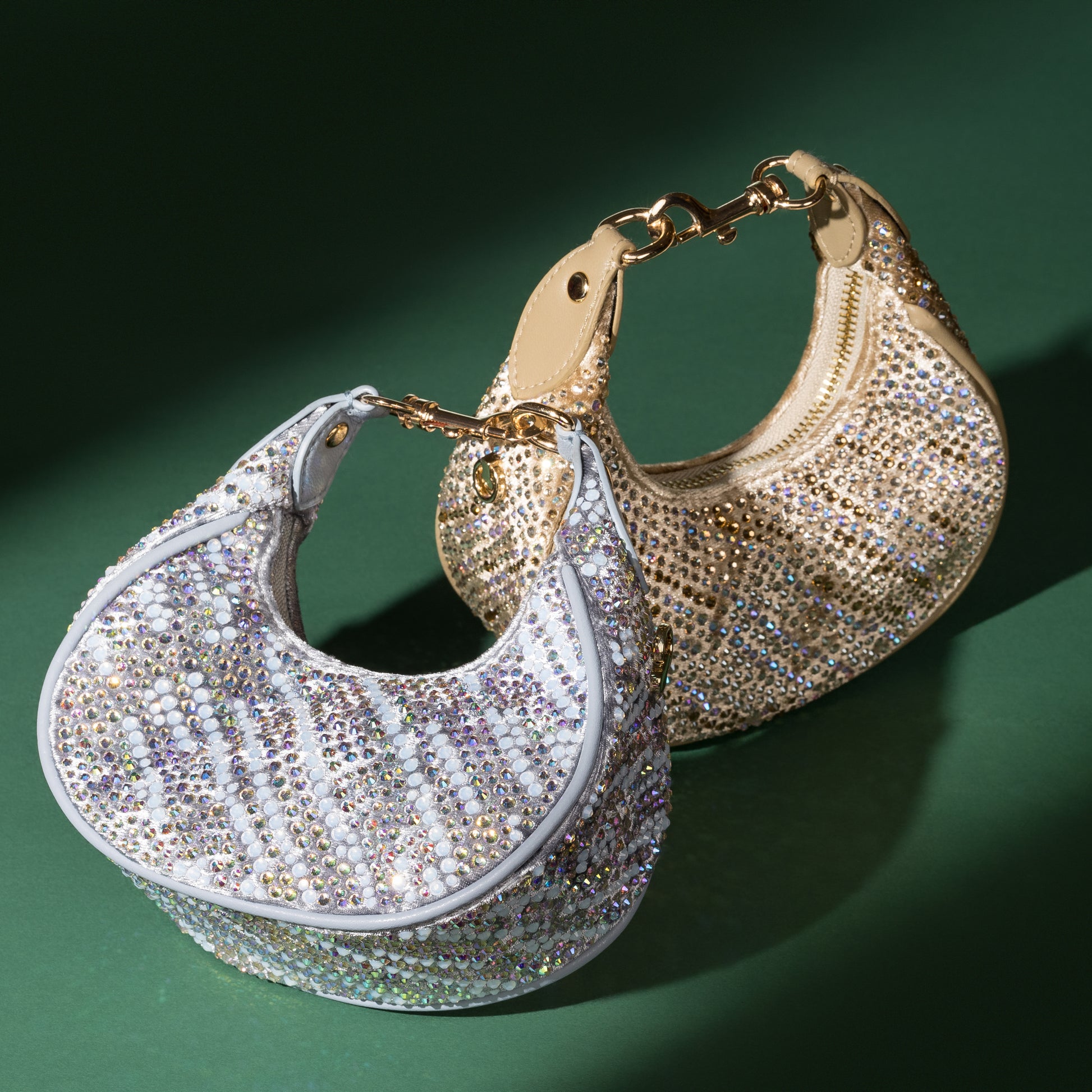 Handcrafted to perfection, this moon shaped bag showcases meticulous attention to detail. Each crystal is carefully selected and expertly applied, creating a shimmering cascade of brilliance that captivates from every angle. What sets this bag apart is its lavish application of Austrian crystals in shades of gold and silver set on a rich gold velvet fabric. Once again a first from House Of BIO.