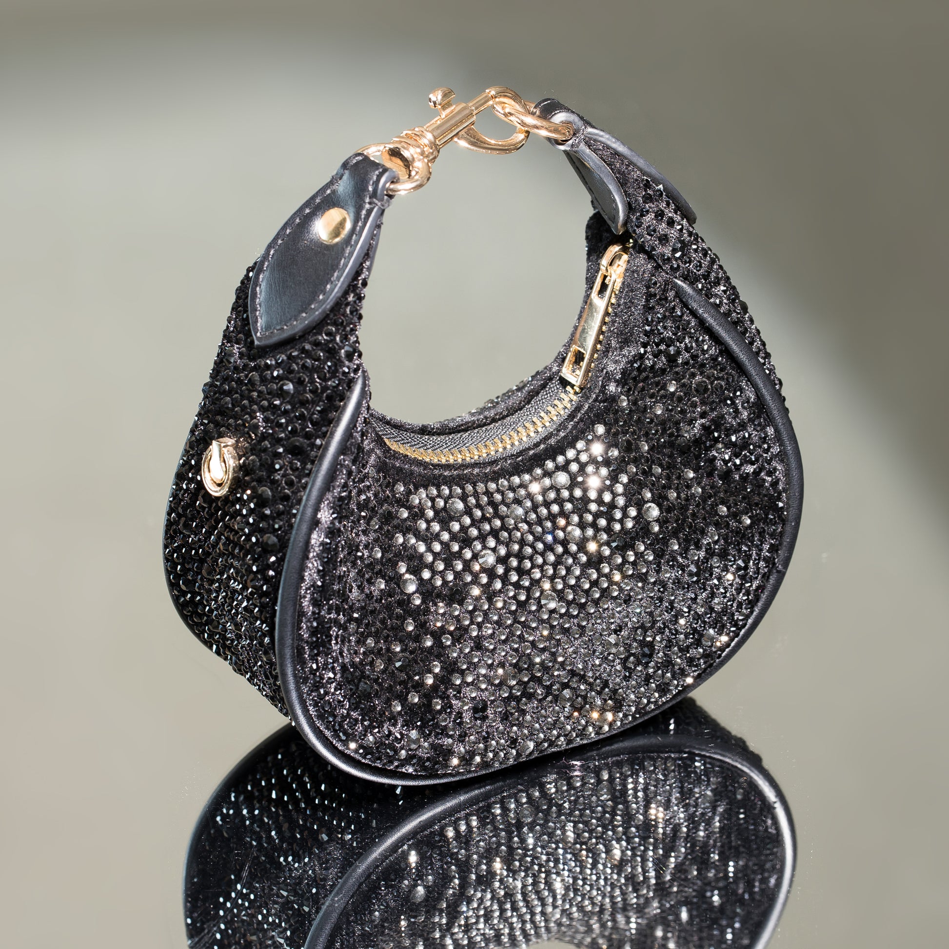 Handcrafted to perfection, this moon shaped bag showcases meticulous attention to detail. Each crystal is carefully selected and expertly applied, creating a shimmering cascade of brilliance that captivates from every angle. What sets this bag apart is its lavish application of Austrian crystals in sparkles of silver on a rich carbon black velvet fabric. Once again a first from House Of BIO.