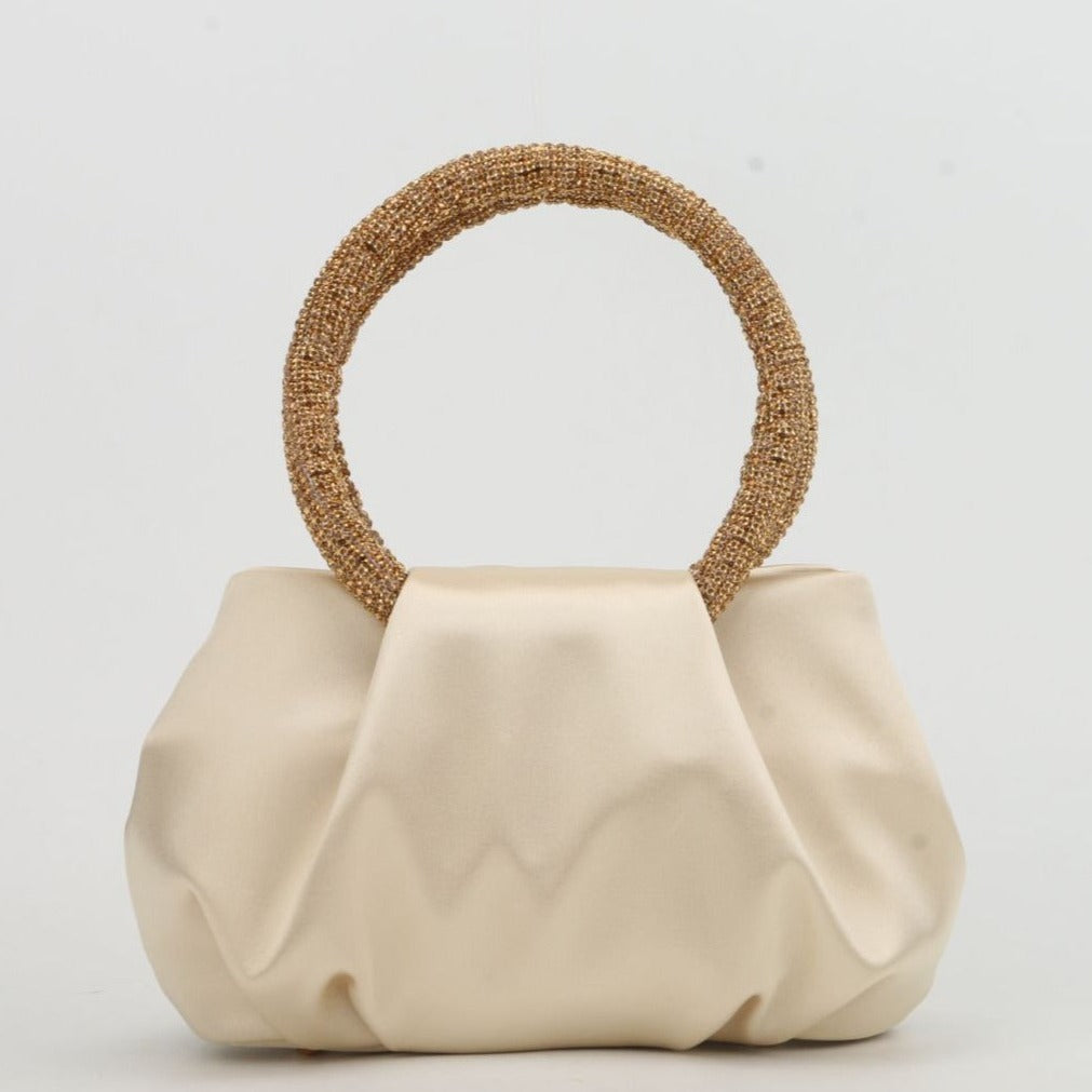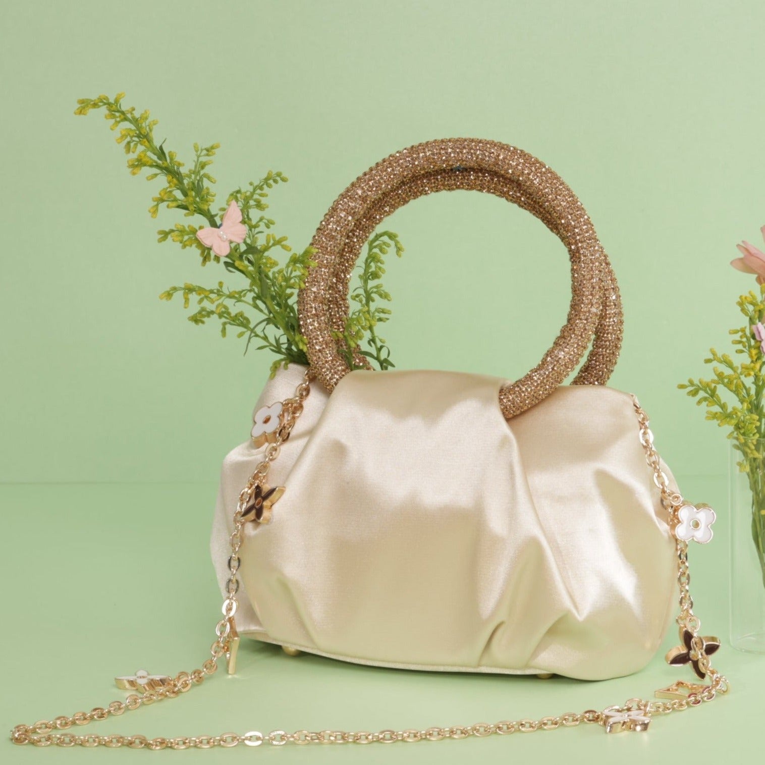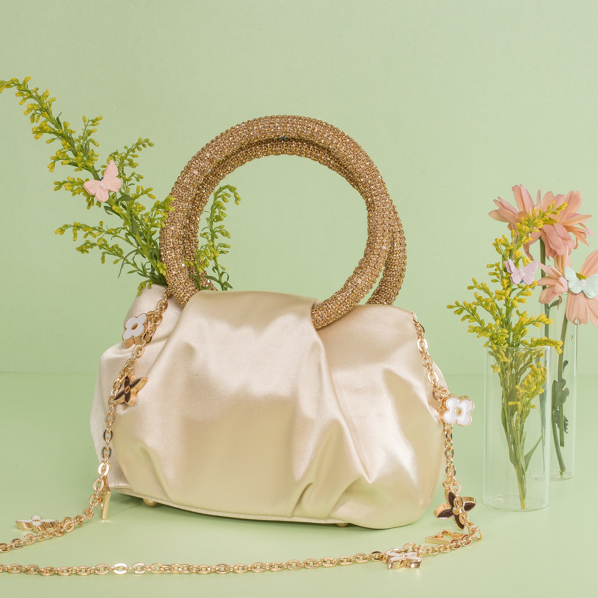 This sublime gold satin fabric bag is highlighted by our custom made crystal studded handle that add a touch of glamour to your cocktail dress or complement your gala attire with grace. This piece come with very exclusive sling chain that has custom made charms on them.